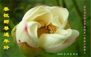 佳节思师尊,感恩师尊慈悲救度! 恭祝师父新年好新年快乐!师尊慈悲保护弟子,弟子感恩真修实修,坚信大法不移,救度众生不停!弟子叩拜师父!合十 河北省石家庄市桥西区全体大法弟子敬上 二零二四年十二月二十日 河北石家庄一学法小组大法弟子恭祝师父新年快乐!