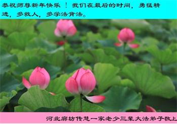 恭祝慈悲伟大的师尊新年快乐! 河北省廊坊一学法小组大法弟子及家人敬上 河北廊坊钰海小区大法弟子恭祝师尊新年快乐!