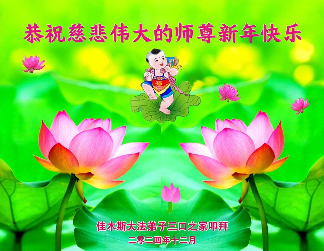 恭祝慈悲伟大的师尊新年快乐! 黑龙江省佳木斯市一大法弟子全家敬上 黑龙江省佳木斯市大法弟子三口之家恭祝慈悲伟大的师尊新年快乐!