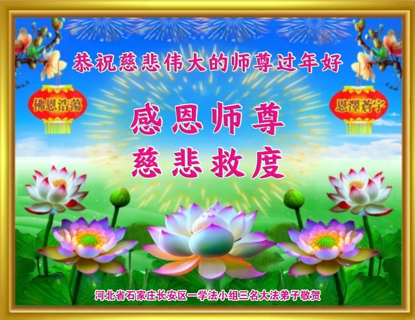 恭祝师尊新年好! 河北省石家庄长安区一学法小组三名大法弟子敬上 河北省石家庄长安区大法弟子携全家恭祝师尊新年好!