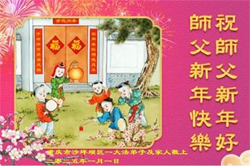 师尊您好!恭祝师尊新年快乐!在这社会不断变化中,我们牢记师尊教导,守住心性,做好三件事,不管形势如何,都不影响我们对大法修炼的正信。请师尊放宽心。 法轮大法好!真善忍好! 重庆一学法小组全体大法弟子叩拜