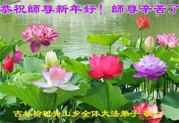 问声师尊新年好 慈悲救人多辛劳 弟子不负师尊爱 多样形式利用好 喜闻乐见送台历 天机尽泄看周报 众生得救谢师恩 大法弟子多荣耀 吉林榆树泗河乡全体大法弟子敬上 吉林省长春市榆树市全体大法弟子恭祝师尊新年好!
