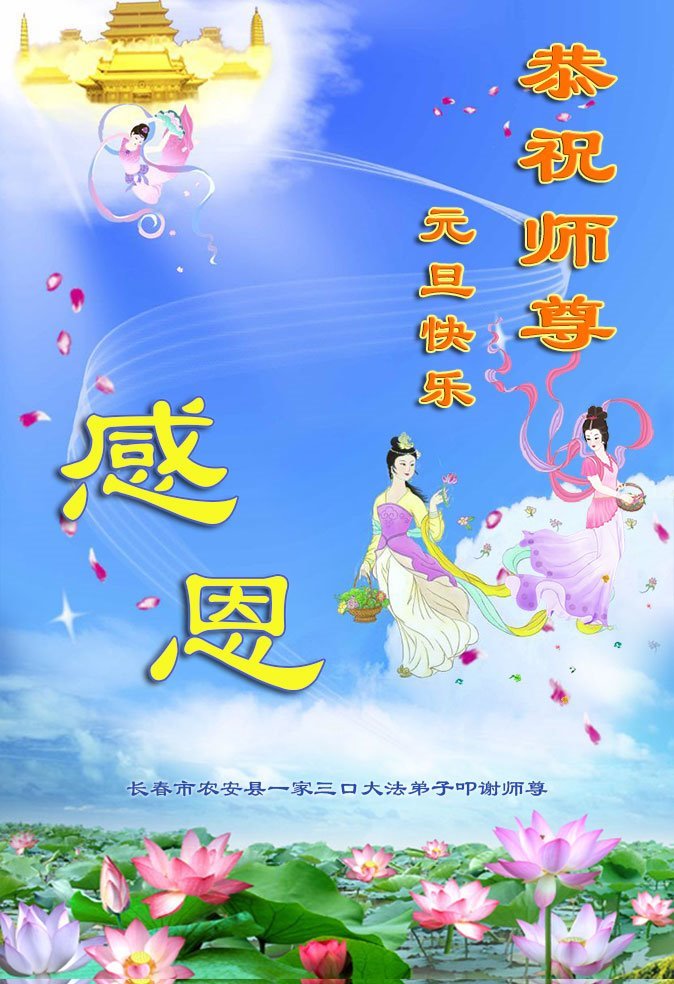 恭祝师尊新年快乐! 新年到新年到 惟愿师尊新年笑 小镇弟子齐努力 救人路上比赶超 吉林榆树五棵树全体大法弟子敬上 吉林省长春大法弟子一家三口恭祝师尊新年好!感恩师尊的慈悲救度!
