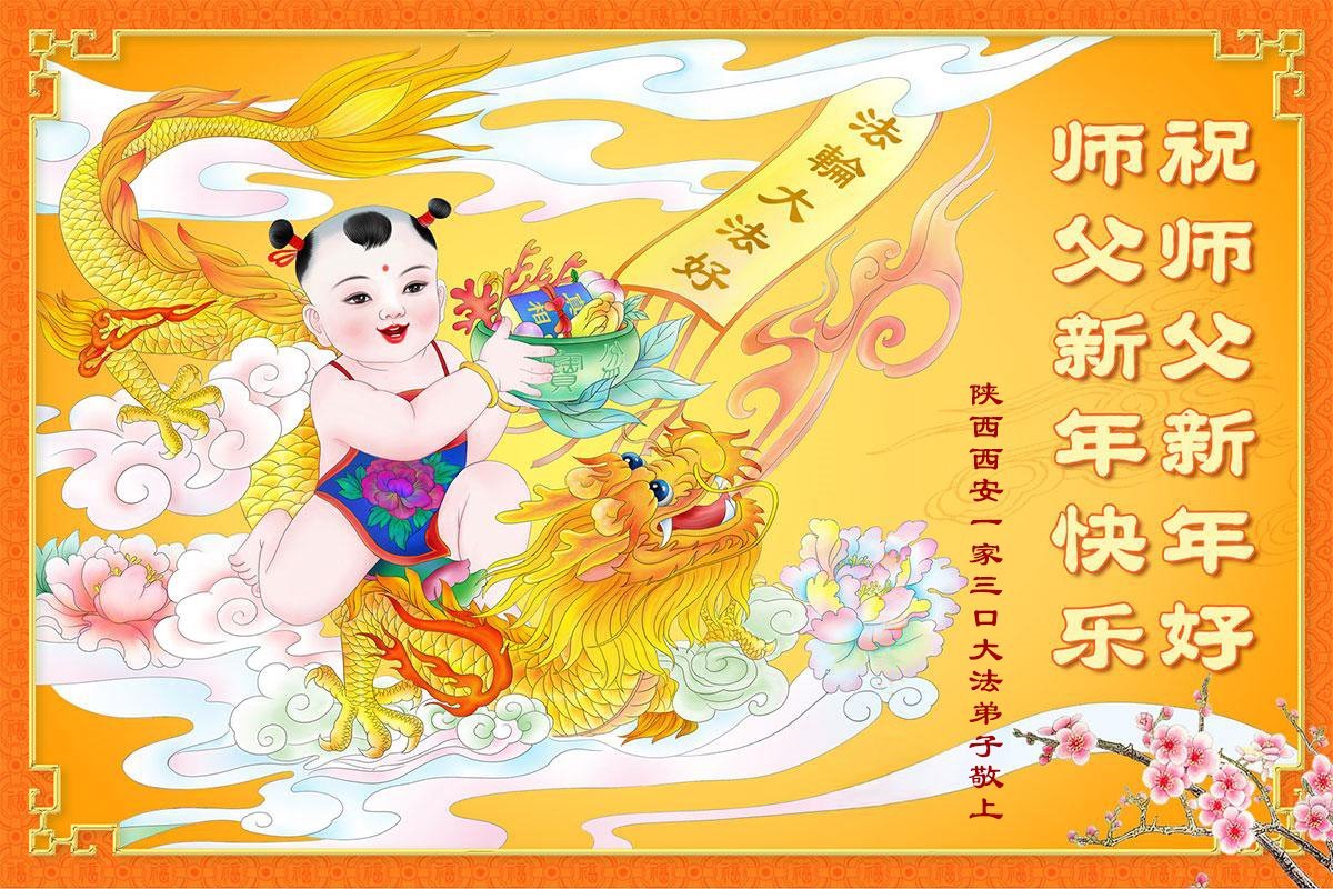 陕西省西安市一家三口大法弟子恭祝师尊新年快乐!