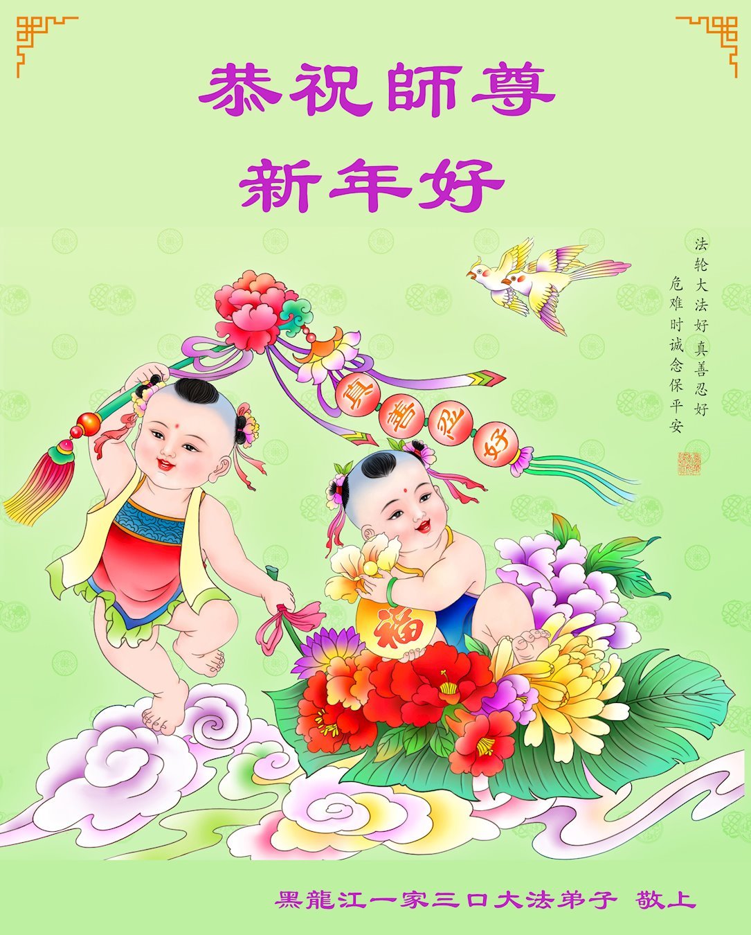 我们一家祖孙三代在此叩拜师尊!感恩师父慈悲救度!新的一年里,弟子们会遵照师尊的教诲,踏踏实实修好自己,助师救度众生! 黑龙江省大法弟子恭祝师尊新年快乐!