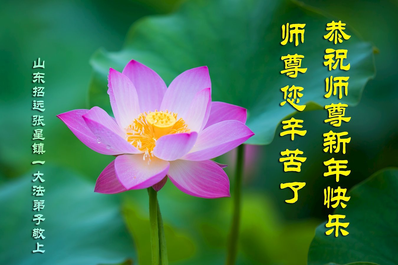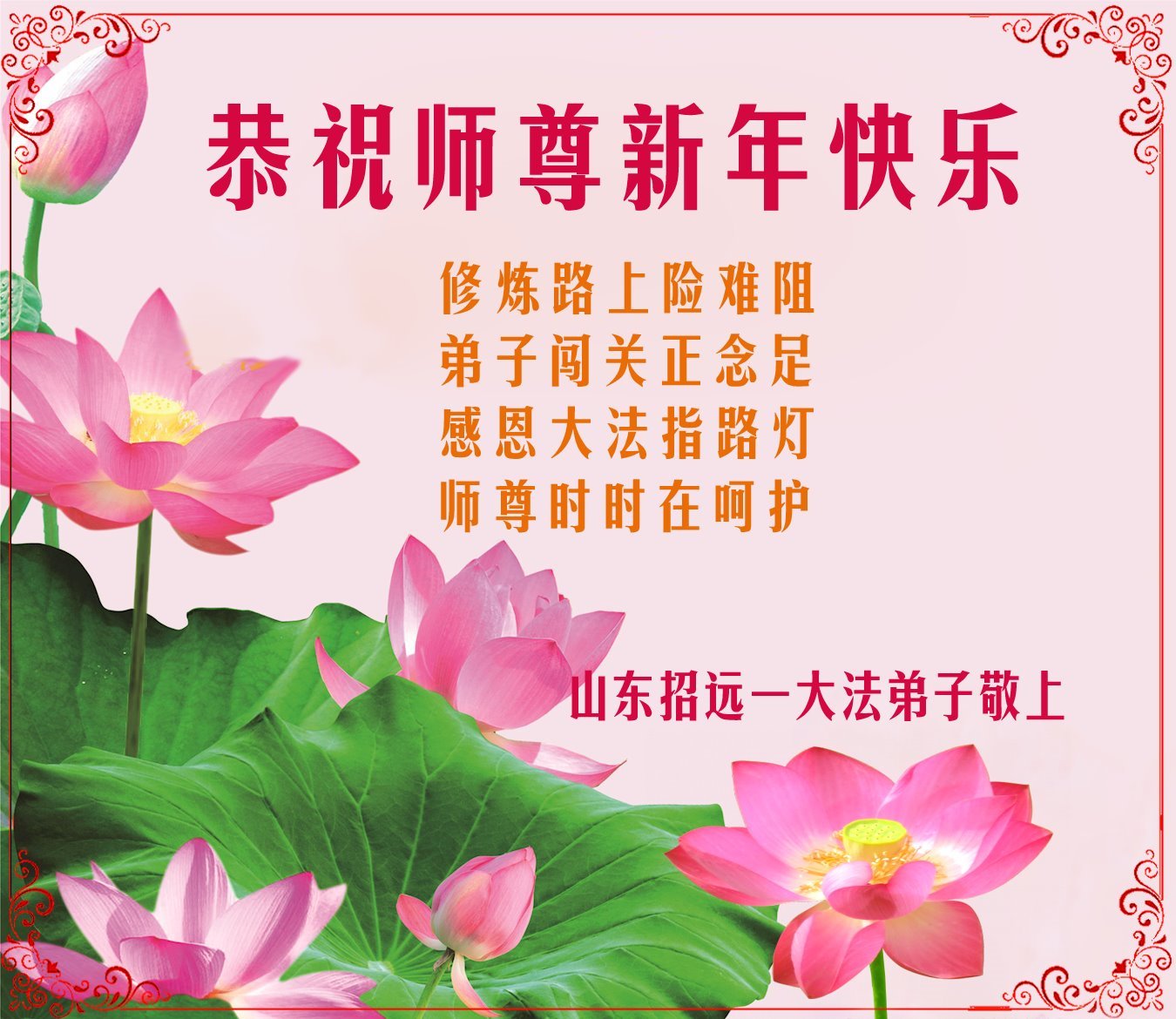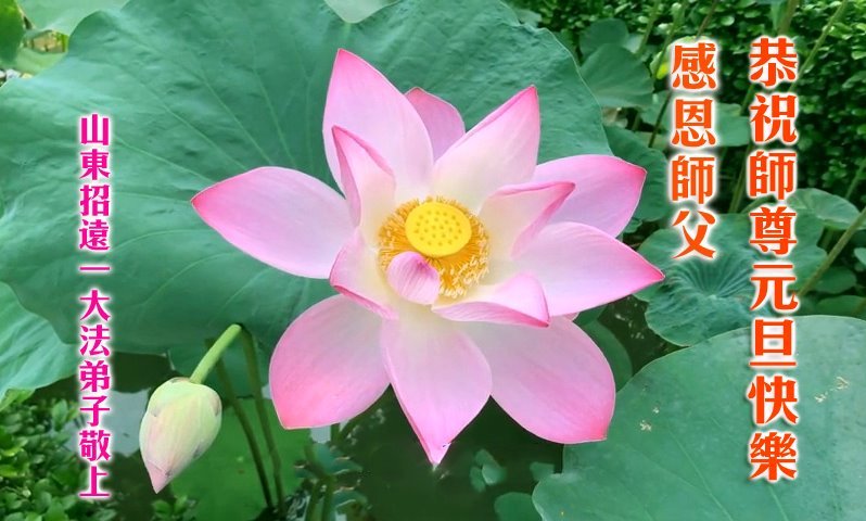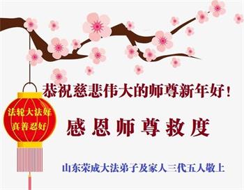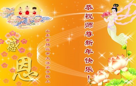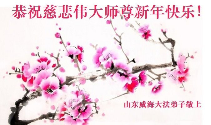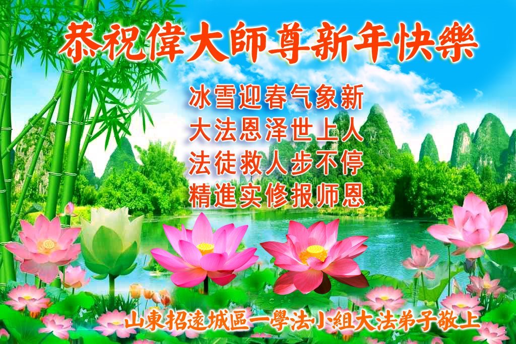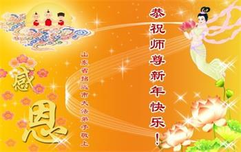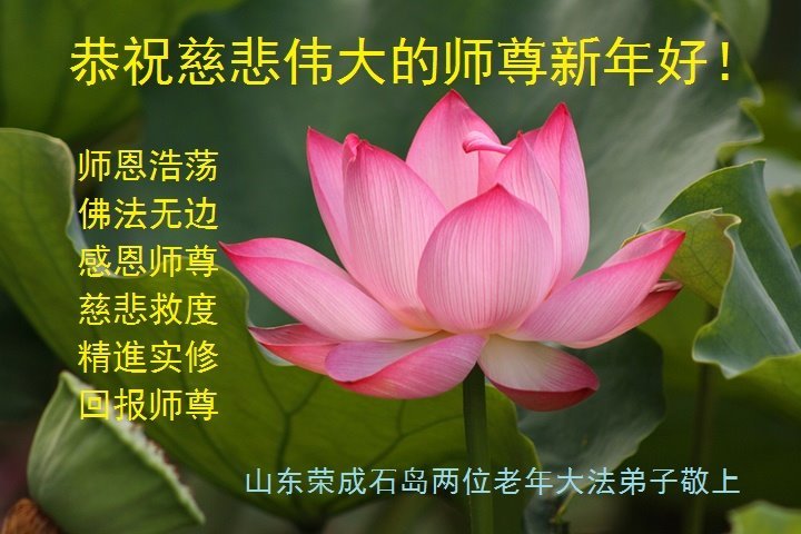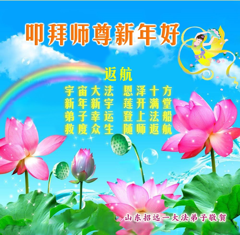 恭祝慈悲伟大的恩师新年快乐! 山东省菏泽市全体大法弟子敬上 山东省烟台市招远市大法弟子携全家人恭祝师尊新年快乐!