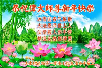 感恩师父的慈悲和救度!恭祝师尊新年快乐!修炼法轮大法,师父不但给我净化身体,净化心灵,使我身心健康。还在慈悲伟大的师父、大法的指导下,用真、善、忍的标准要求自己,修炼自己,明白了人生的真谛。在师父的保护、点悟和加持下,不断的提升自身的道德品行。无论在家庭还是在社会,都做好人,做道德高尚更高尚的人。弟子一定不忘使命,用心做好三件事,多学法、学好法。要真修、实修,和同修互相学习,共同提高,多救人。圆满随师还。 山东省威海市文登区一大法弟子叩拜 山东省烟台招远一大法弟子恭祝慈悲伟大的师尊新年快乐!