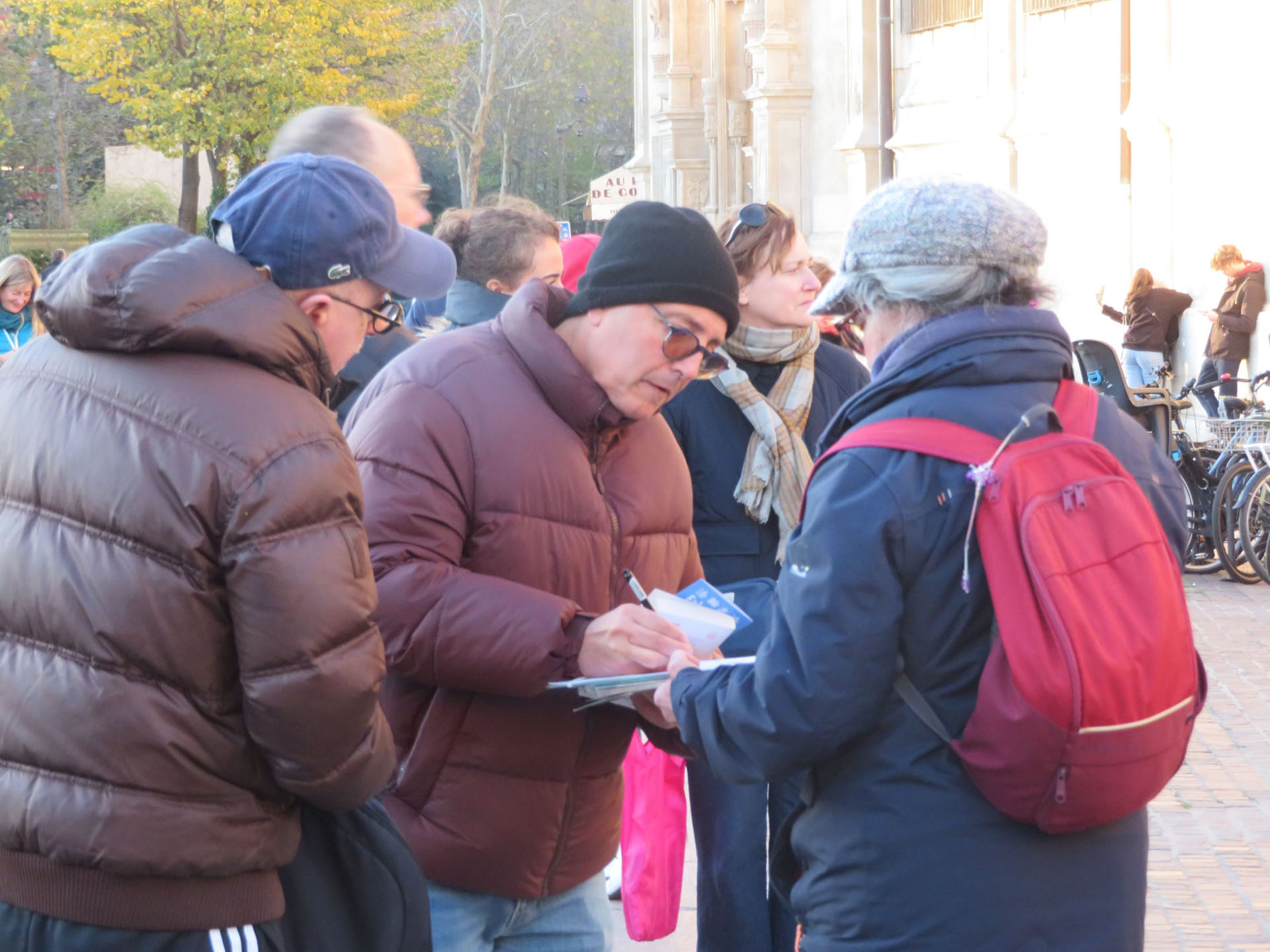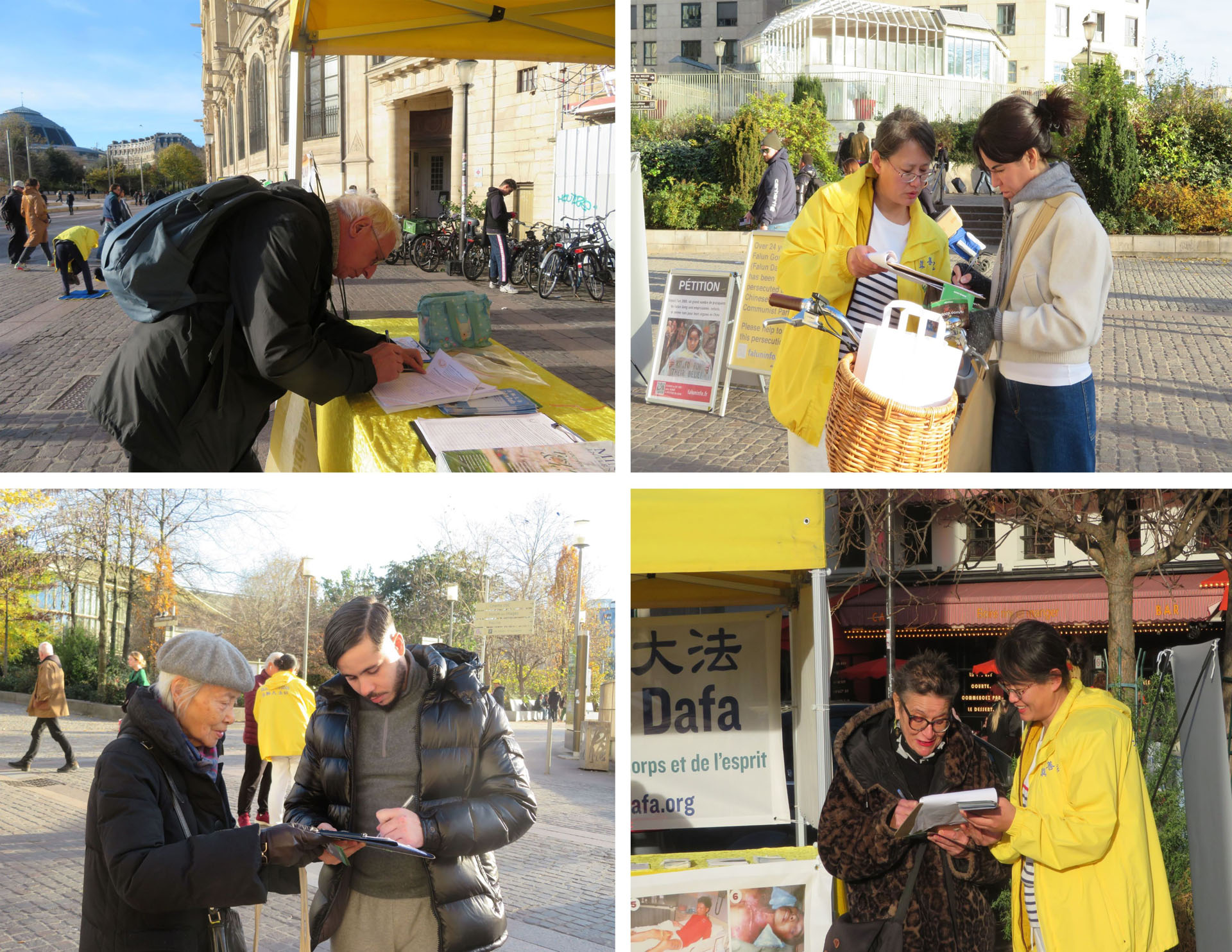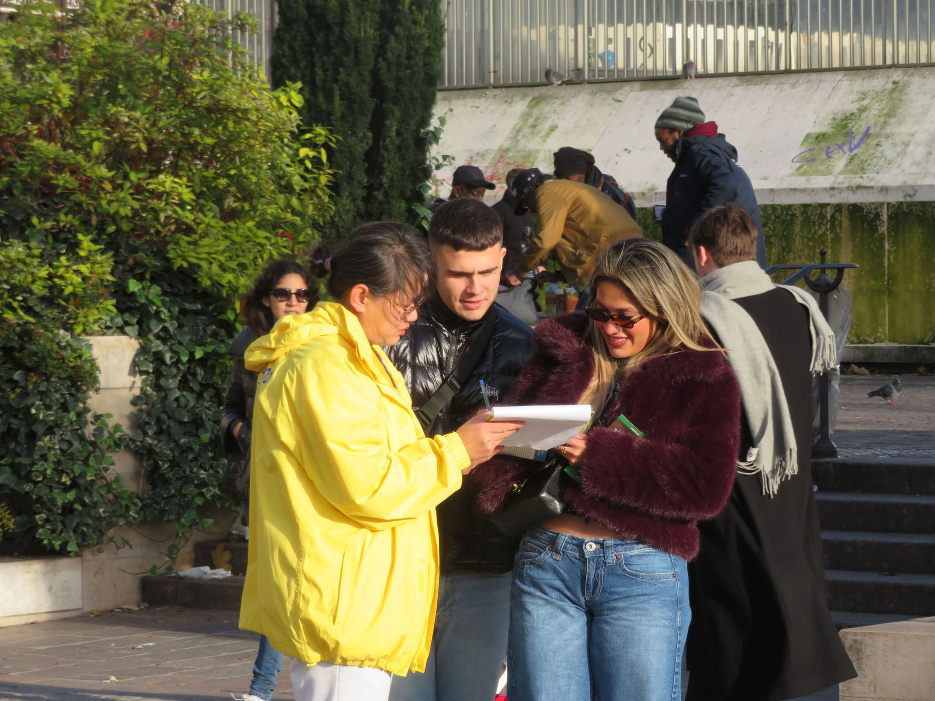 多米尼加国・雷蒙德(Dominique Raymond)从法国东部的梅兹(Metz)来巴黎出差。她说:“我反对任何形式的野蛮行为,无论你是亚洲人还是象我一样出生于法国但有犹太血统的人,无论我们的经历如何,我们都是这片土地的公民,也是世界的公民。”“当我看到这一切时,我看到了野蛮和器官摘取,这是最可怕的。把人类当作零件来贩卖,这很恐怖。” 她表示见到法轮功学员,让她看到了美好的人群。她说她要把法轮功的真相在电视媒体上传播。 勒内・卡尔丰(RenéKalfon)曾经在政治庇护申请者的接待中心工作,现已退休。他了解中共迫害法轮功和活摘器官的事实。他主动在征签表上签名,他拿了《明慧周报》等法轮功真相资料,他说:“我反对那些极权国家,他们阻止法轮功学员、维吾尔族、藏族等少数民族修炼。我认为中共应改善其政策。这样不行……这实在不正常。” “要实现和平,必须付出巨大的代价” 三十七岁的马尔基(Malki)是地理历史老师。他和法轮功学员交谈了很长时间。他认为,只要一个家族、一个团体或一个社区不对他人造成困扰,针对任何形式的迫害,我们都必须保护人类。他说:“迫害者这样做,那是因为他们感到恐惧。”“发动战争很容易,但要实现和平,必须付出巨大的代价。” 泰伊丝(Thaïs)是糕点师,她认为,法轮功这样一种简单而充满善的炼功方法,专注于身心健康,这样的功法能够传递下去非常重要。她还认为,真、善、忍是重要的价值观,她觉得很美。  图10~11:很多民众纷纷在请愿书上签名,支持法轮功学员反迫害。 |