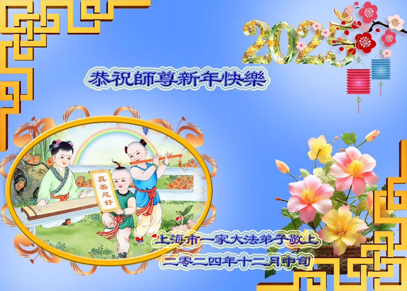 恭祝师尊2025元旦快乐! 上海市闵行区一大法弟子敬上 上海浦东新区一夫妻大法弟子率全家九人恭祝师尊新年快乐!