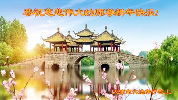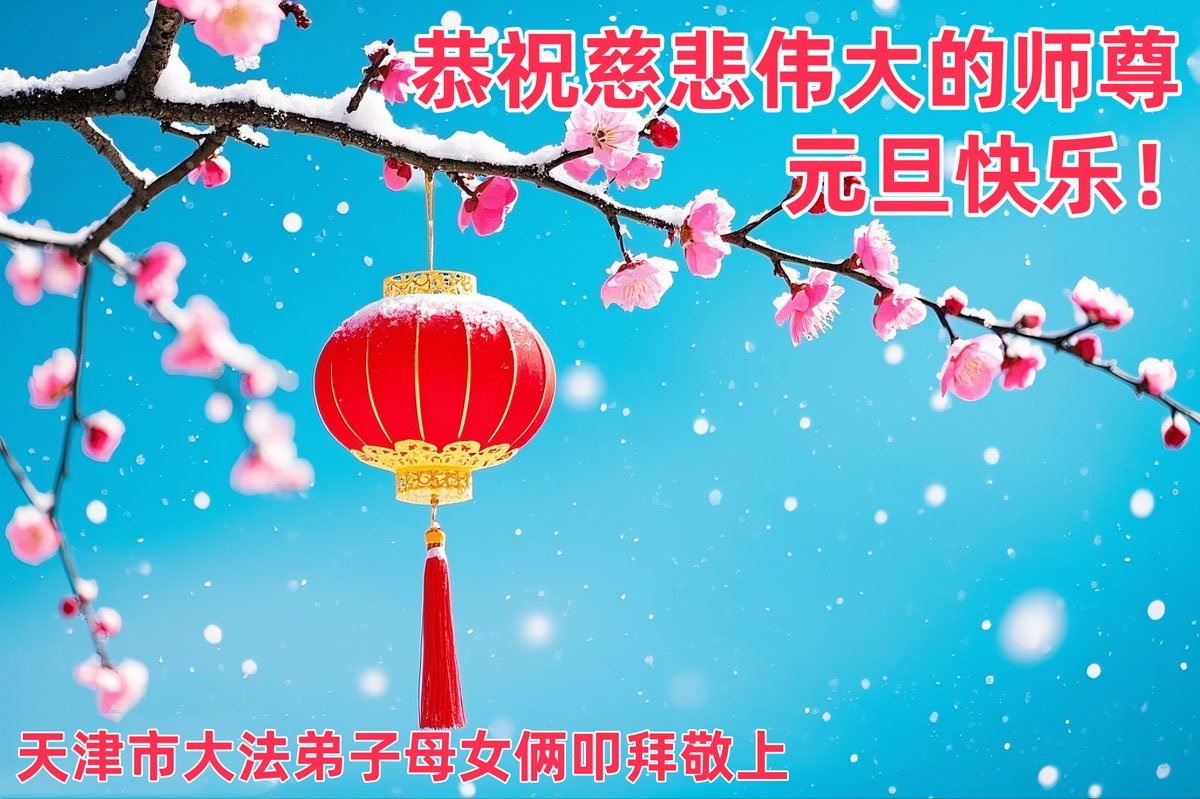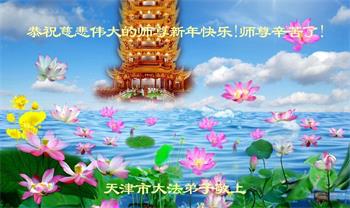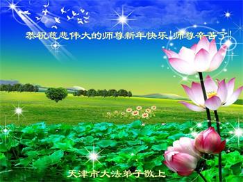 恭祝慈悲伟大的师尊新年快乐! 感恩师尊救命之恩!师尊辛苦了! 天津市大法弟子敬上 天津市一大法弟子恭祝慈悲伟大的师尊新年快乐!