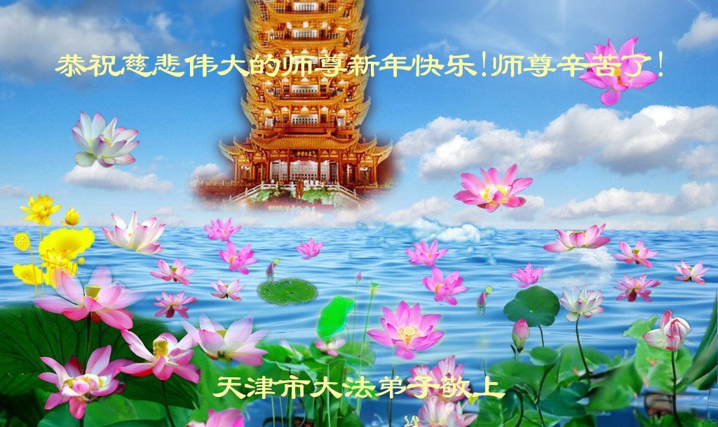 恭祝慈悲伟大的师尊新年快乐! 师尊辛苦了! 感恩师尊救命之恩! 天津市一大法弟子敬上 天津市大法弟子恭祝慈悲伟大的师尊新年快乐!