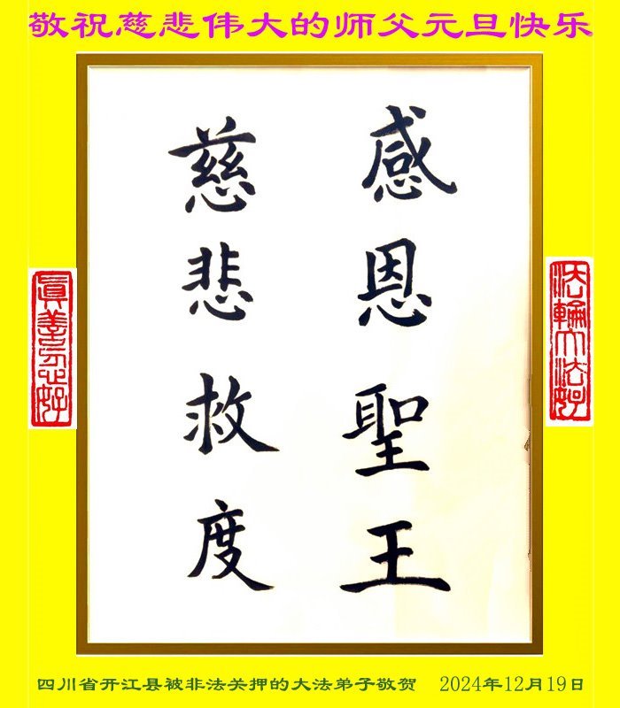 敬祝慈悲伟大的师父元旦快乐! 四川省开江县被非法关押的大法弟子敬上 二零二四年十二月十九日 四川省达州市开江县被非法关押的大法弟子恭祝慈悲伟大的师父新年快乐!