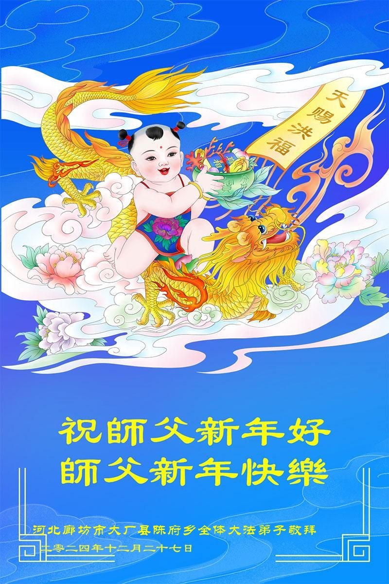 感恩师尊的慈悲苦度!弟子的感恩无以言表,唯有不断精進、再精進。 河北廊坊市大厂县陈府乡全体大法弟子恭祝慈悲伟大的师尊新年快乐!