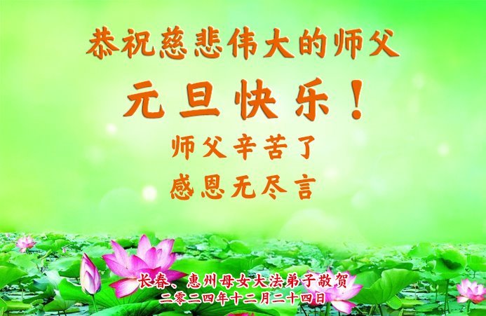 恭祝慈悲伟大的师尊新年快乐! 感恩师尊的慈悲苦度! 广东省汕头市澄海区全体大法弟子敬上 二零二四年十二月二十七日 广东省深圳一青年大法弟子恭祝师尊新年快乐!
