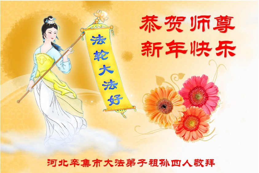 恭祝师父新年快乐!弟子要做好三件事,提高心性,跟师父回家。 河北省石家庄一学法小组大法弟子及家属共28人敬上 河北省石家庄市辛集市一大法弟子全家恭祝师尊新年快乐!