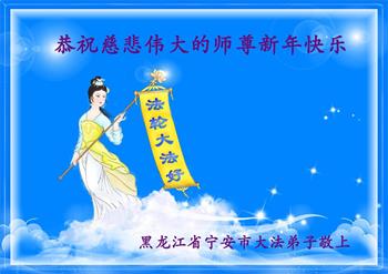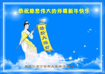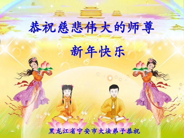 师父您好,感恩师尊慈悲苦度!在新的一年里,弟子一定让师父少操心!我一定要精進再精進,做一个合格的弟子。恭祝慈悲伟大的师尊新年快乐! 黑龙江省宁安市大法弟子敬上 黑龙江省牡丹江市宁安市全体大法弟子恭祝慈悲伟大的师尊新年快乐!
