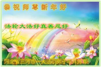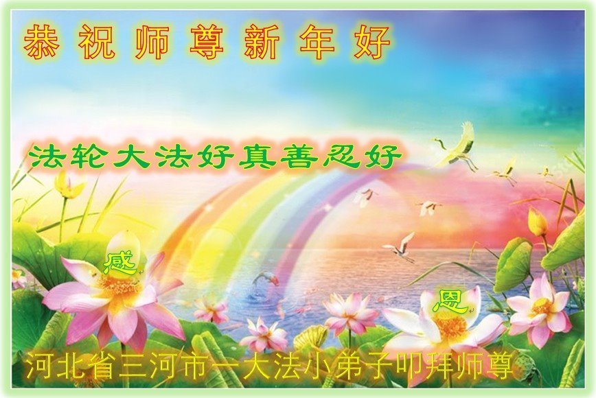 感恩师尊慈悲救度! 弟子们一定不辜负师尊的慈悲救度,谨遵师尊的教诲,做好三件事,去执著人心,多学法,多救人,圆满随师还! 河北省唐山一大法小弟子敬祝师父新年快乐!
