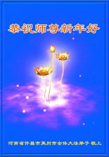 祝师尊元旦快乐! 弟子在今后的修炼当中,一定要正念正行,走正走好最后的修炼道路。多学法、学好法、以法为师,遇到任何事向内找,做好三件事,不辜负师尊的慈悲苦度! 河南省许昌市禹州市全体大法弟子敬上 河南一大法弟子师祝师父新年快乐!