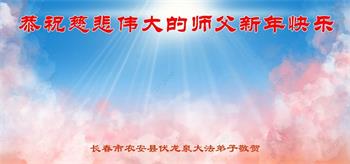 恭祝慈悲伟大的师父新年快乐!在新的一年里,弟子继续配合同修,做好三件事,跟上师父正法進程,跟师父回归。 吉林省长春市农安县伏龙泉大法弟子敬上 吉林省长春大法弟子恭祝慈悲伟大的师父新年快乐!