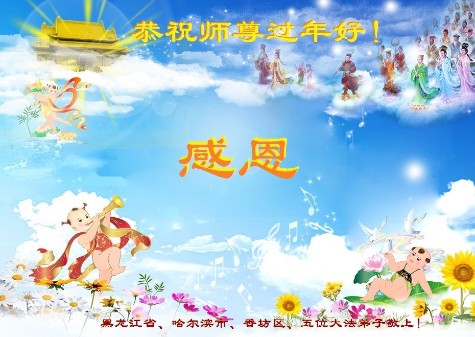 衷心感谢师父对弟子的救度之恩! 弟子一定要做好三件事,兑现誓约,越到最后越精進,圆满跟师父回家。 黑龙江省哈尔滨市香坊区五位大法弟子恭祝师尊新年快乐!