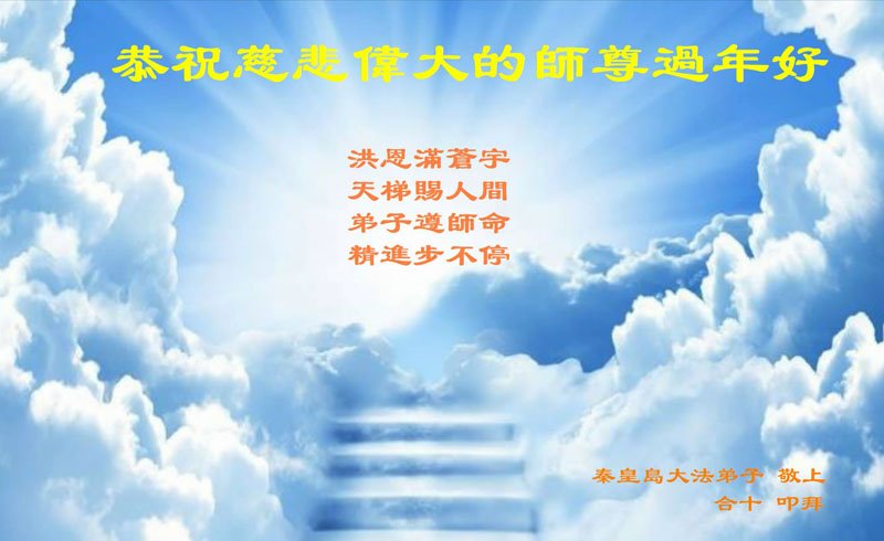 师尊洪恩浩荡!多谢师尊慈悲救度弟子并保护弟子家人。新的一年,弟子继续做好三件事,圆容整体,在大法中修正自己,希望自己做的更好,修炼路走的更正,成为一个真正无私的生命! 再次感谢师尊! 河北秦皇岛市一大法弟子恭祝慈悲伟大的师父新年快乐!