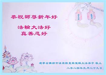 弟子一定记住师父的教诲做好救人的事,请师父放心。 辽宁省抚顺市清原县夏家堡镇一位大法弟子及家人恭祝师父新年好!