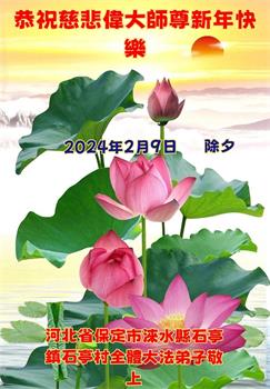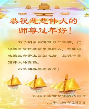 【明慧网二零二四年二月十日】 河北保定市高碑店市东片的全体大法弟子恭祝师尊新年快乐!