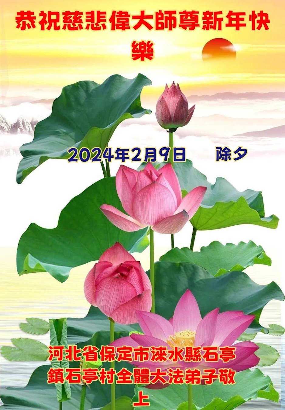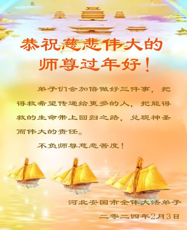 喜迎龙年除夕到 恭祝师尊新年好 得救众生感师恩 弟子惟愿师尊笑 救度法船已起航 真相大显苍宇耀 河北保定望都大法弟子敬上 河北省保定容城县一学法小组大法弟子恭祝师父新年快乐!