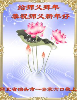 我们全家给师父拜年,恭祝师父新年好! 法轮大法好!真善忍好! 师父辛苦了!谢谢师父救度洪恩。 河北省沧州市泊头市一大法弟子全家六口人敬上 河北省沧州市泊头市王武乡一大法弟子恭祝师父过年好!