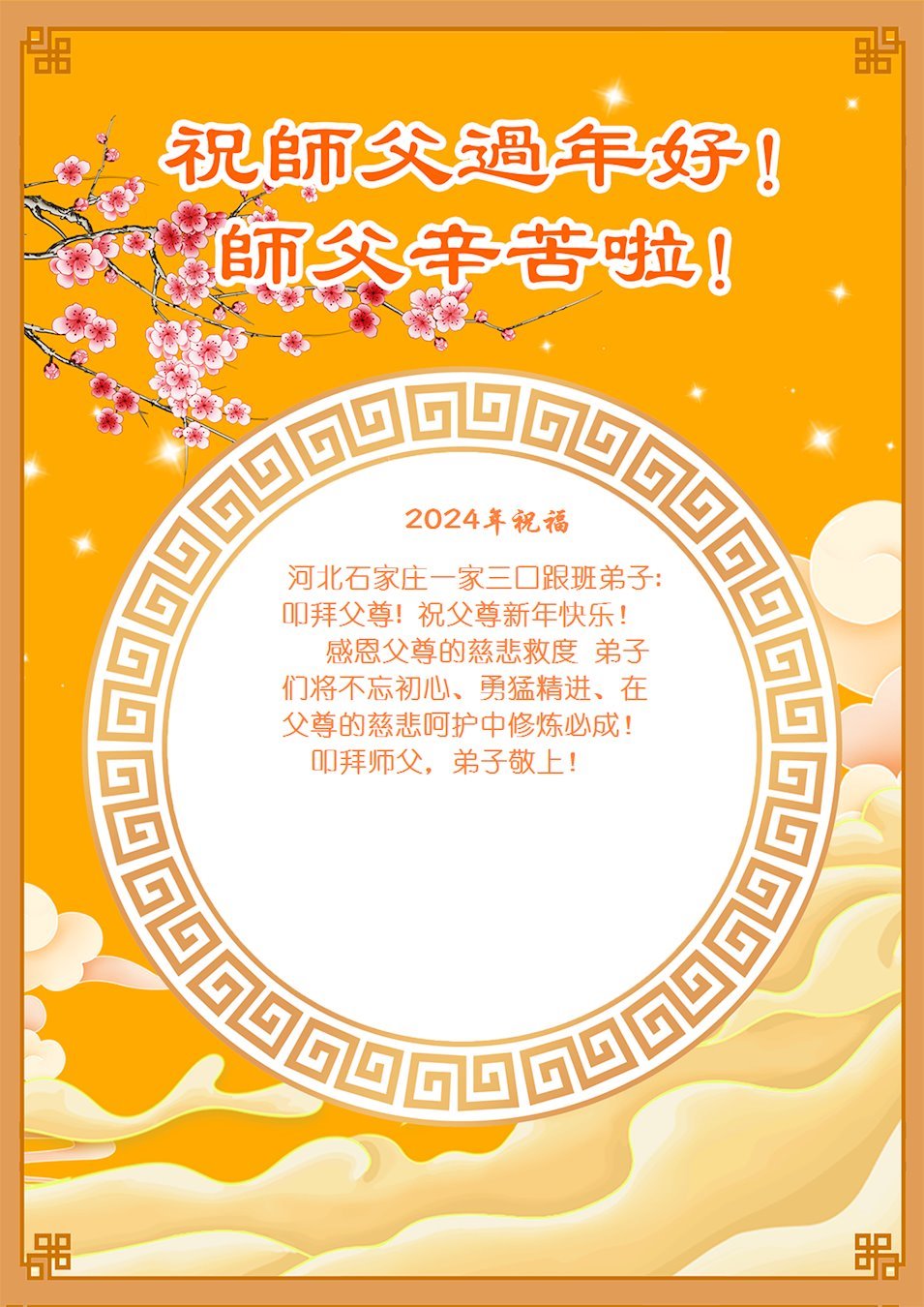石家庄大法弟子敬上 二零二四年二月二日 河北石家庄一大法弟子携全家恭祝慈悲伟大的师父过年好!