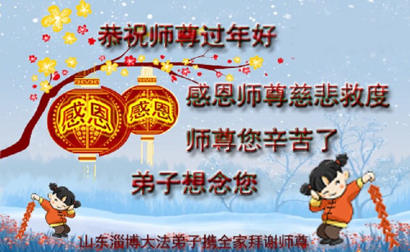 师尊您好,弟子感恩师尊的慈悲救度!师父辛苦了!法轮大法好 真善忍好! 在这辞旧迎新之际,弟子感恩师尊的慈悲救度,弟子在这五年的魔难和过关中,师父为弟子调整身体,弟子不知道师父为弟子承受了多大的罪业。弟子一定会在法中向内找,归正自己,跟师父回家,弟子向师父敬上内心的感恩,恭祝师尊新年快乐! 合十 山东省烟台市龙口一大法弟子敬上 山东烟台芝罘区一夫妻大法弟子恭祝师尊过年好!