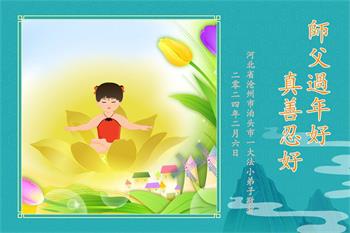 山东省德州市十岁大法小弟子恭祝师父新年好!给师尊叩头了! 伟大的师尊,您辛苦啦! 十岁大法小弟子叩谢师尊慈悲救度!恭祝师尊新年快乐! 学唱一首《插莲花》献给师尊: 小小的月儿呀天上挂 我坐在小船上划呀划 美丽的地球上有多少国家 闪闪的星星你知道吗? 我要一个一个去插莲花 六十多个国家开莲花 六十多个国家拥有他 法轮大法你知道吗? 六十多个国家热爱他 山东省德州市十岁大法小弟子敬上 二零二四年一月十七日 河北省石家庄市大法弟子恭祝慈悲伟大的师尊过年好!