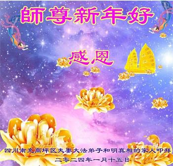 师尊您好! 一年一度的传统佳节即将到来之际,南充地区纺织行业的全体大法弟子和明真相的世人向慈悲伟大的师尊拜年啦!遥祝师尊过年好! 四川省南充市纺织行业的全体大法弟子敬上 二零二四年一月十五日 四川省南充市高坪区夫妻大法弟子和明真相的家人遥祝伟大的师父新年好!