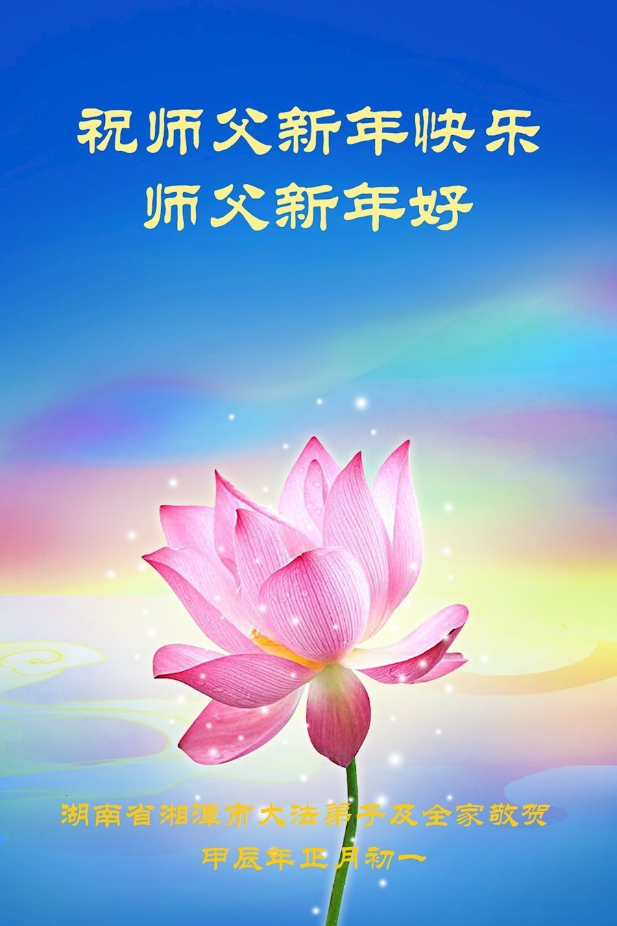 湖南省湘潭市大法弟子及全家敬祝慈悲伟大的师父新年好!新年快乐! 谢谢师父的慈悲苦度。师父讲的“真、善、忍”法理使我们修炼成为了好人,我们一定做好向世人讲清真相,让更多人明白真相,沐浴大法慈光远离险恶,获得美好未来。 湖南郴州中原国际城老大法弟子恭祝师父过年好!