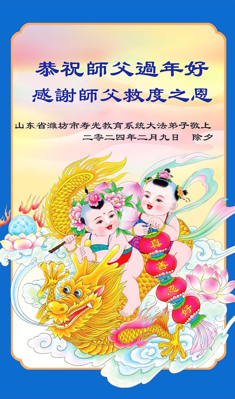 山东省潍坊市寿光教育系统大法弟子敬上 二零二四年二月九日 除夕 山东省青岛市胶州市教育系统全体大法弟子恭祝慈悲伟大的李洪志师父过年好!