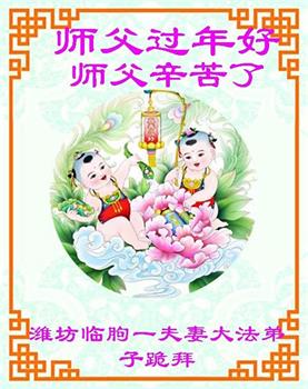山东省潍坊市高密市一大法弟子全家恭祝慈悲伟大的师尊新年快乐!师尊您辛苦了,感谢师尊的慈悲救度! 叩拜师尊 山东省潍坊市高密市一学法小组大法弟子恭祝慈悲伟大的师尊新年快乐!感恩师尊的救度之恩,谢谢师尊! 山东潍坊市临朐县一夫妻大法弟子恭祝慈悲伟大的师父过年好!