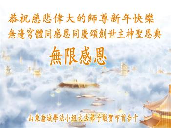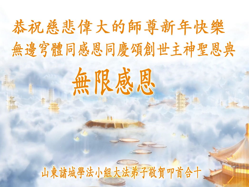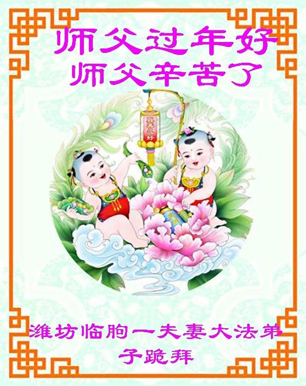 师父您好!师父您辛苦了! 您为救度众生付出了您的一切,特别为大陆的大法弟子更是操尽了心,在这乱世中,在这史无前例的迫害中,您时时都在弟子身边看护着,保护着弟子,您承受着巨大的痛苦,为弟子化解罪业,弟子们才能从这史无前例的迫害的浩劫中走出来。弟子无法用言语来表达对师尊的感恩,唯有听师父的话,修好自己,多救人,圆满跟师父回家! 山东潍坊大法弟子恭祝师尊新年快乐!
