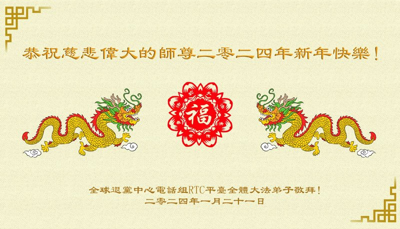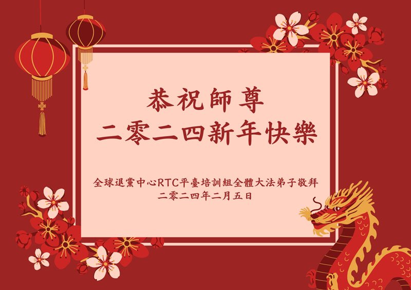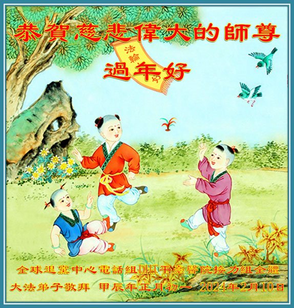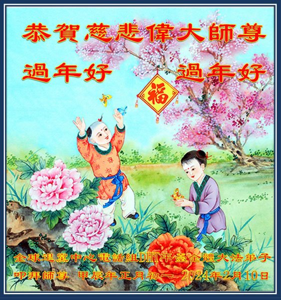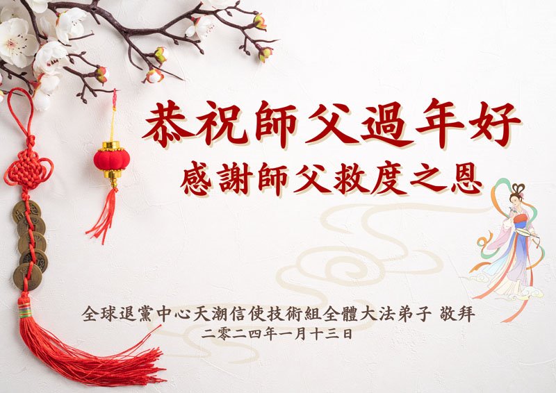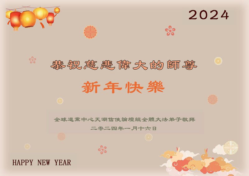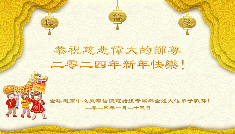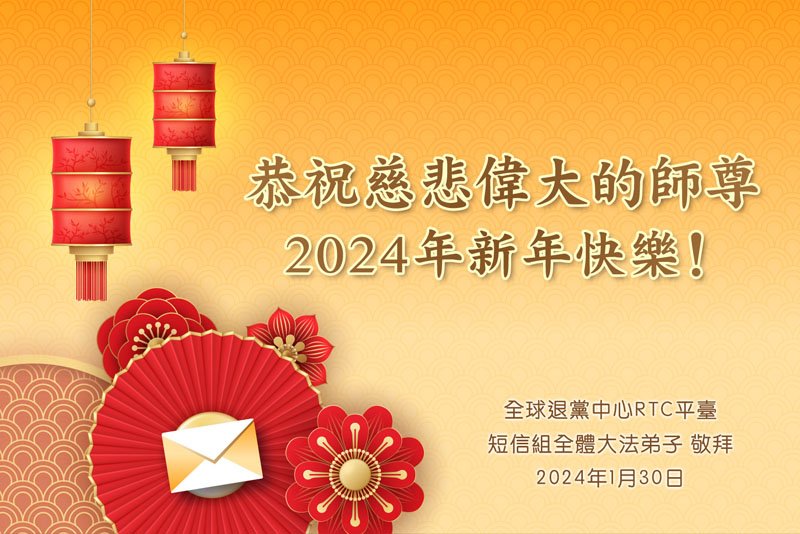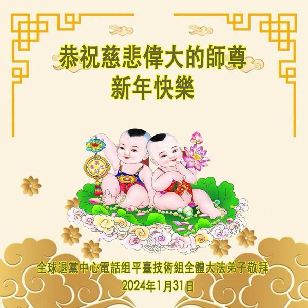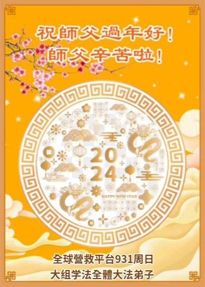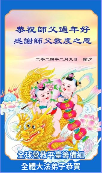 感谢师尊的慈悲救度。弟子一定会谨记师恩,勇猛精進。 旅居欧洲大法弟子敬上 二零二四年二月九日 除夕 全球营救平台901明慧当日迫害案件真相组全体大法弟子恭祝师尊新年好!
