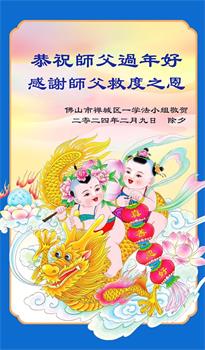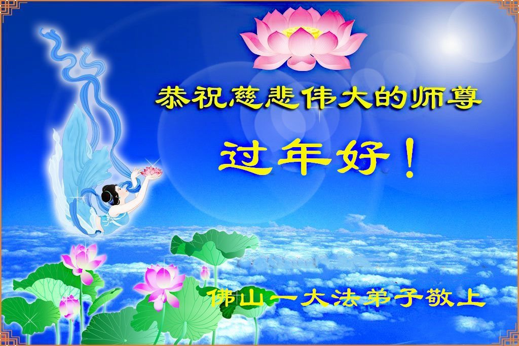 恭祝师父过年好!感恩师父慈悲救度,真心想跟师父回家,请师父加持,叩拜。 佛山市禅城区一学法小组大法弟子敬上 二零二四年二月九日 除夕 广东省佛山一大法弟子恭祝师父过年好!