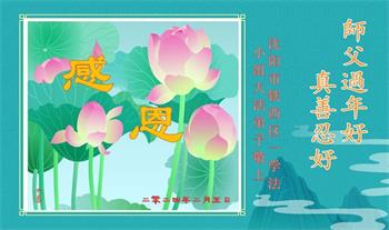 感谢师尊慈悲救度!去人心、去执着、讲真相,兑现来时发的愿。 辽宁沈阳二人讲真相小组弟子敬上 辽宁沈阳市铁西区一学法小组大法弟子恭祝慈悲伟大的师尊过年好!