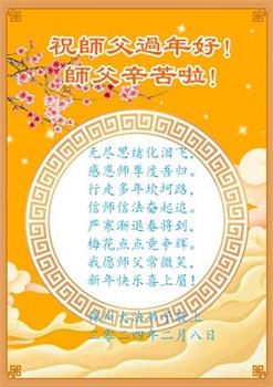 师父:在您巨大的承受压力下宇宙又迎来了新的一年,弟子说不尽对您洪大慈悲的感恩,祝您在新的一年少一份操劳,多一份欣慰。 弟子盼望早一天在大陆和您相见! 辽宁锦州黑山十名大法弟子的心声 2024年2月5日 辽宁省锦州市一对夫妻恭祝师尊过年好!师尊辛苦了!