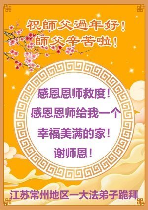 感恩恩师救度! 感恩恩师在黑窝里三次救命! 感恩恩师给我一个幸福美满的家! 江苏常州地区一大法弟子敬上 江苏省南京市一大法弟子携家人恭祝慈悲伟大的师父过年好!