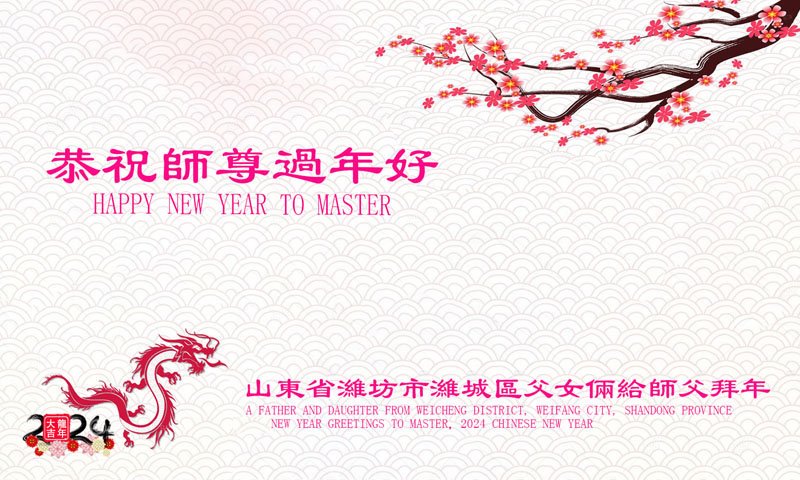 在2024年新年来临之际,恭祝慈悲伟大的师父:过年好!感恩师父的慈悲苦度,在正法的最后时刻。弟子们谨遵师父的谆谆教诲,做好三件事,修心去执着,整体协调好,多救人,圆满随师还,不辜负师父的期望,不让天上的众生失望! 合十 跪拜师父 山东省潍坊市高密市东北乡学法小组大法弟子 山东省潍坊市潍城区一女大法弟子和不修炼的父亲给师父拜年!恭祝师尊过年好!