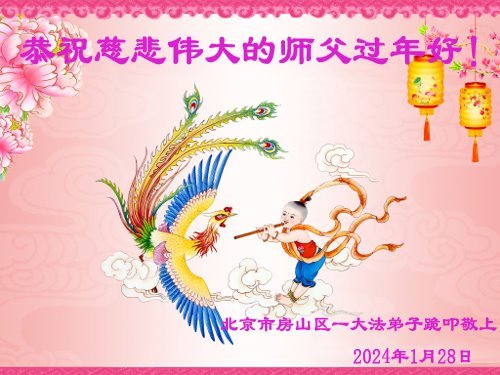 弟子恭祝慈悲伟大的师父过年好!感恩师父的慈悲救度! 北京市房山区一大法弟子跪拜敬上 2024年1月28日 北京市房山区一大法弟子恭祝慈悲伟大的师父过年好!