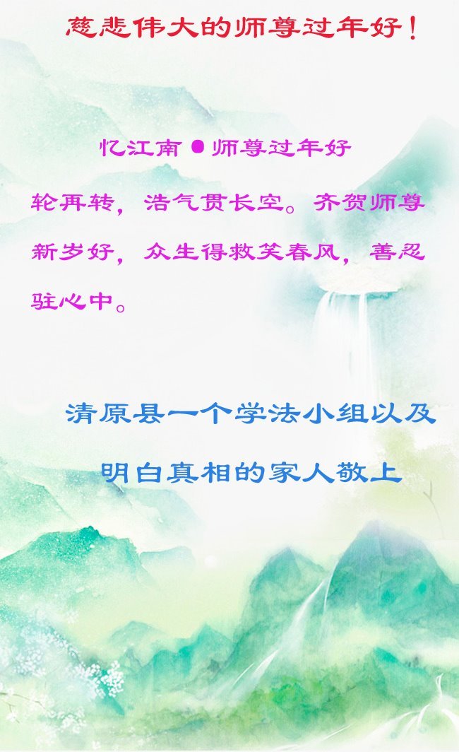 慈悲伟大的师尊过年好! 忆江南·师尊过年好 轮再转,浩气贯长空。齐贺师尊新岁好,众生得救笑春风,善忍驻心中。 清原县一个学法小组大法弟子以及明白真相的家人敬上 山东省潍坊市临朐县明真相世人恭祝慈悲伟大的李大师新年好!