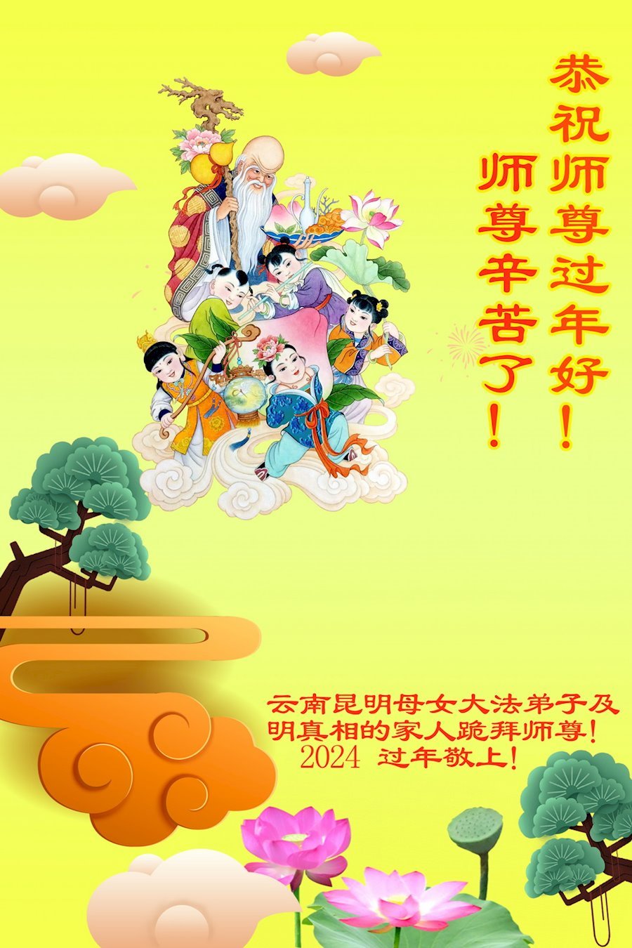 恭祝慈悲伟大的师尊新年快乐! 感恩师父对我们的慈悲苦度,时时事事看护着我们,使我们能够在法上精進,修好自己,多救人,我们无法用语言来表达对师父的感恩。只有实修、真修,时时向内找,不管正法还有多长时间,我们都要坚定的跟师父一修到底,最后圆满随师把家还。 谢谢师尊!谢谢师尊!谢谢师尊! 跪拜师尊 大连市三个学法小组大法弟子及明真相的家人敬上 二零二四年一月二十八日 云南省昆明母女大法弟子及明真相的家人恭祝慈悲伟大的师尊过年好!