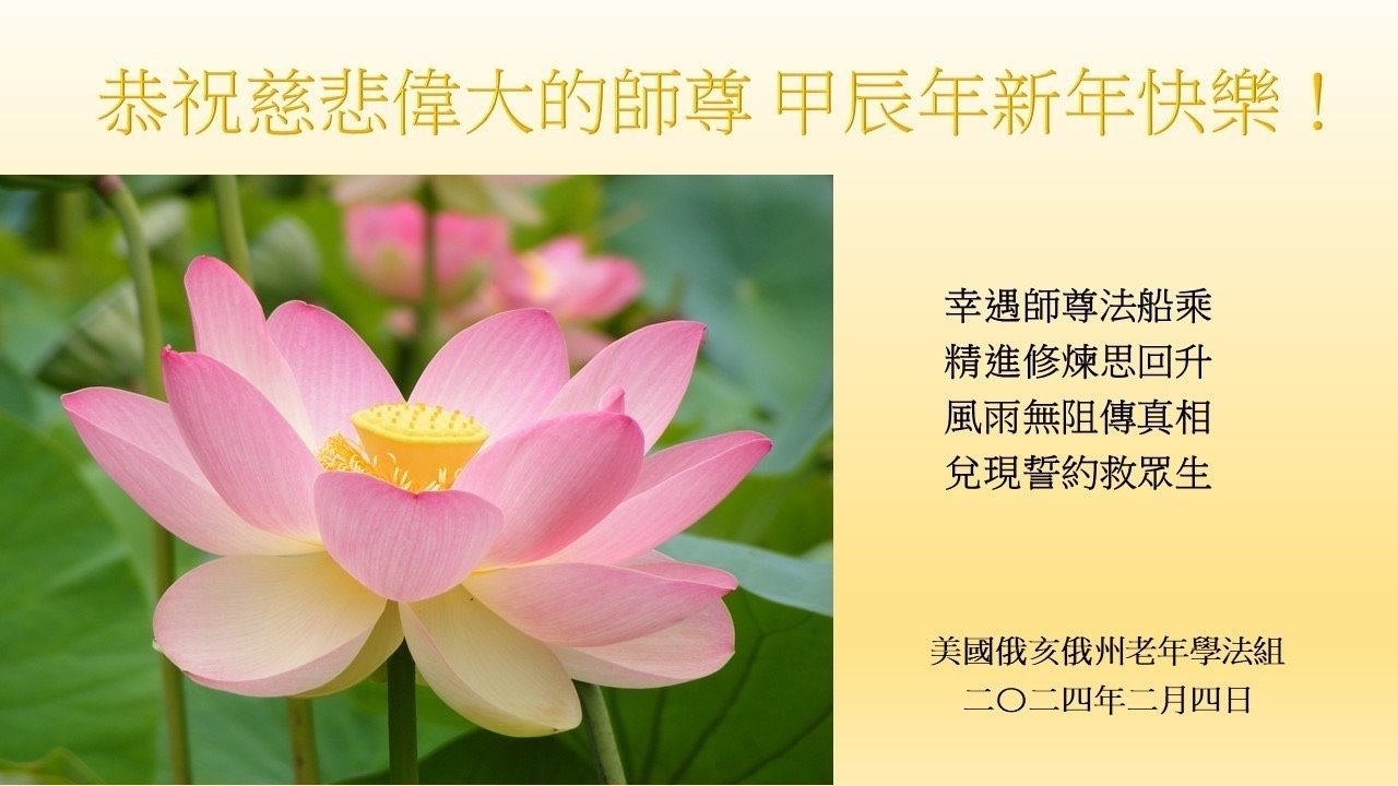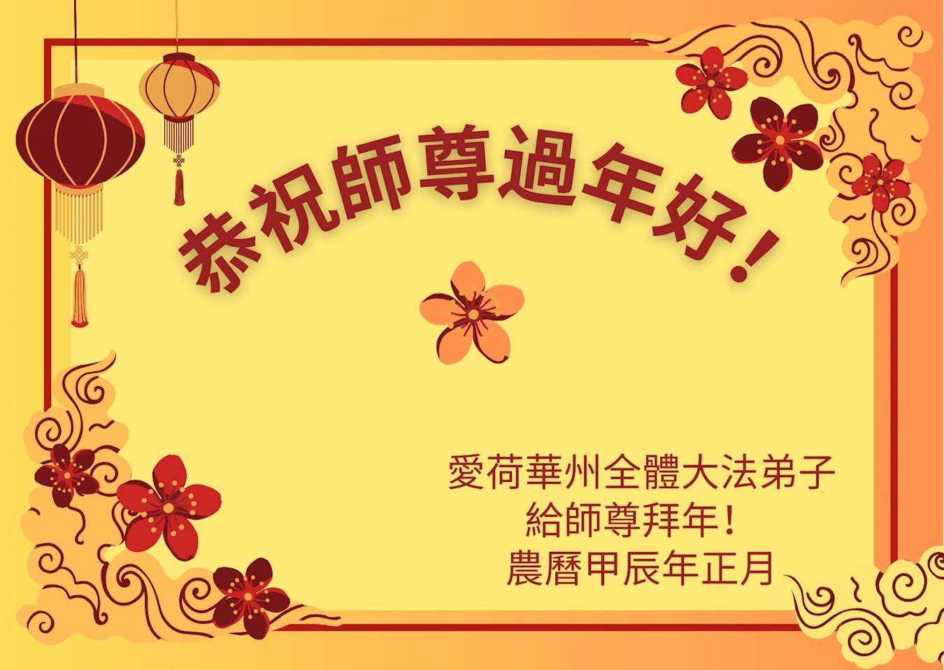 【明慧网二零二四年二月十一日】甲辰年新年之际,美国俄亥俄、内布拉斯加、密苏里、明尼苏达、伊利诺伊、密西根、爱荷华、堪萨斯、肯塔基大法弟子恭祝师尊新年好! 美国大芝加哥地区全体大法弟子恭祝慈悲伟大的师尊过年好!