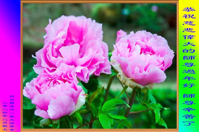 感恩师尊慈悲救度!在新的一年中,我们要继续坚定的走师父指点的大法弟子的路,做好三件事,抓紧时间学法,修心,发正念,讲真相救众生,兑现誓约,做名副其实的大法弟子。 美国明尼苏达州一家大法弟子恭祝慈悲伟大的师父过年好!