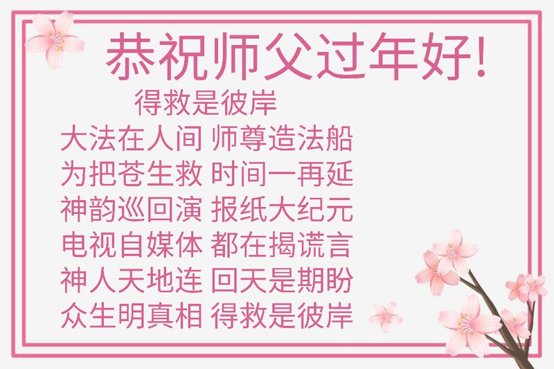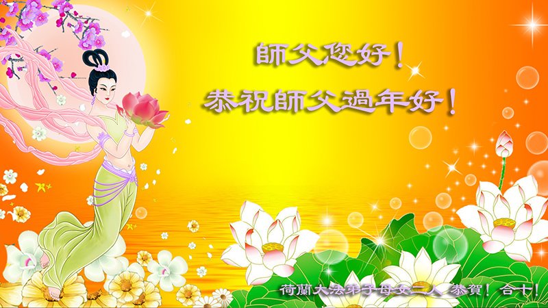 慈悲伟大的师父过年好!感谢师父慈悲保护。弟子刚来到海外不久,环境的变迁、语言、生活、出行等许多方面都感到师父的慈悲点化和保护。弟子深知自己的使命,一定真修实修,修好自己。与海外同修配合好,尽力广传真相,使可救的生命走上回归之路。 弟子再次叩谢师恩! 荷兰大法弟子母女二人恭祝师尊过年好!