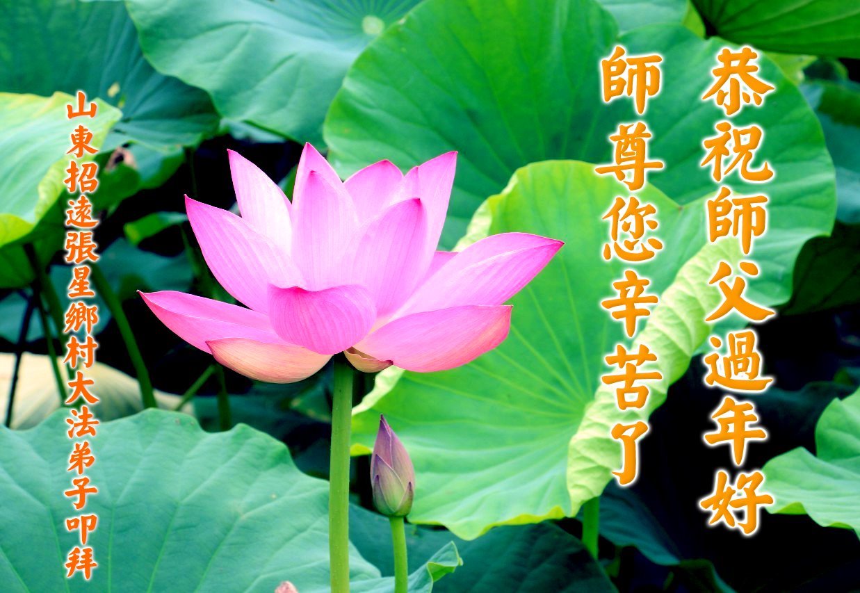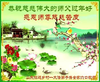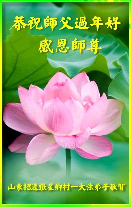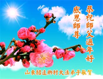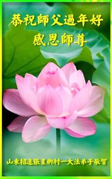 伟大的师尊您好! 法轮大法好,真善忍好。 中国传统新年就要到了,我们抱着感恩的心给师父拜年!恭祝慈悲伟大的师父过年好!过年快乐! 弟子一定听师尊的话,做好三件事,跟师尊回家! 山东省烟台市招远市乡村大法弟子恭祝师父过年好!